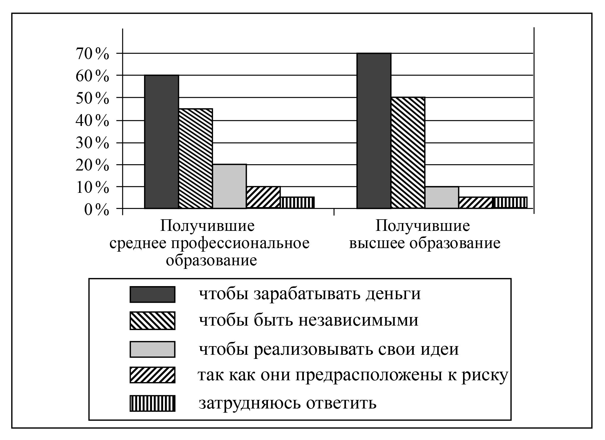 Задание 9. В ходе социологического опроса совершеннолетних граждан, имеющих разный уровень образования, им задавали вопрос: «Как Вы думаете, почему люди занимаются предпринимательством?» (можно было выбрать не более двух ответов). Полученные результаты (в % от числа опрошенных) представлены в виде диаграммы.