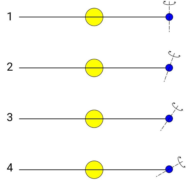 Горизонтальная линия —— плоскость орбиты планеты, штриховая линия —— ось, вокруг которой вращается планета. Все орбиты круговые./