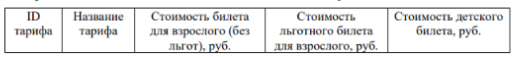 Таблица «Цены» содержит информацию о ценах на билеты в зависимости от времени и сезона. Заголовок таблицы имеет следующий вид.