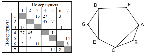 Так как таблицу и схему рисовали независимо друг от друга, нумерация населённых пунктов в таблице никак не связана с буквенными обозначениями на графе. Определите, какова сумма протяжённостей дорог из пункта G в пункт D и из пункта B в пункт A.