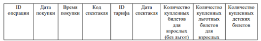 Таблица «Продажа билетов» содержит записи о количестве проданных различным категориям посетителей билетов на спектакли. Заголовок таблицы имеет следующий вид.
