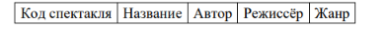 Таблица «Спектакли» содержит информацию о репертуаре театра. Заголовок таблицы имеет следующий вид.