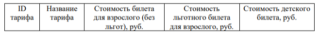 Таблица «Цены» содержит информацию о ценах на билеты в зависимости от времени и сезона. Заголовок таблицы имеет следующий вид.