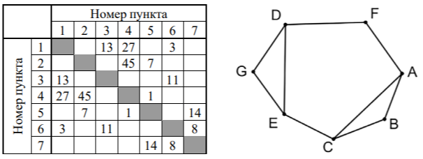 Так как таблицу и схему рисовали независимо друг от друга, нумерация населённых пунктов в таблице никак не связана с буквенными обозначениями на графе. Определите, какова сумма протяжённостей дорог из пункта G в пункт E и из пункта B в пункт C.