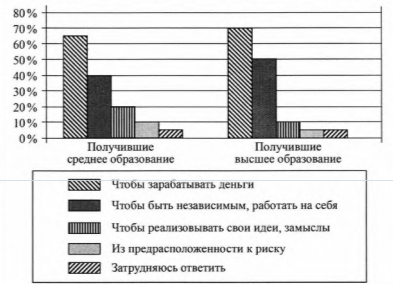 Задание 9. ходе социологического опроса совершеннолетних граждан, имеющих — разный уровень образования, им задавали вопрос: «Как Вы думаете, почему люди занимаются предпринимательством?» (можно было выбрать не более двух ответов). Результаты опросов (в % от числа отвечавших) приведены на диаграмме.