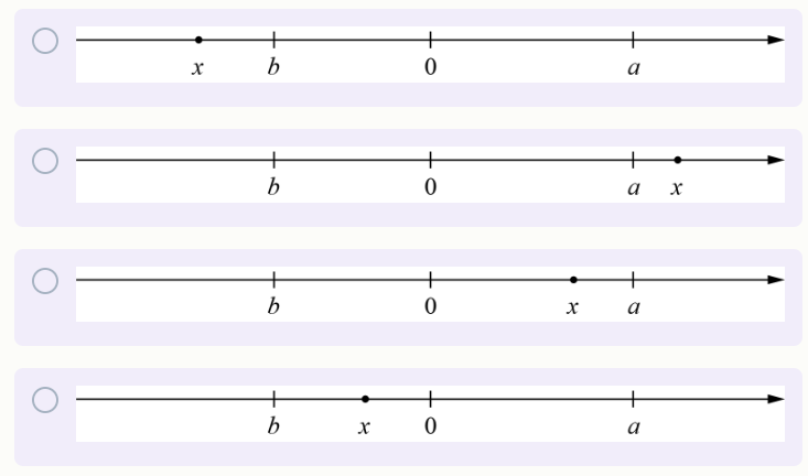 Укажите, на каком рисунке изображена точка x , для которой одновременно выполняются три неравенства: x−b>0 , −b2x>0 , x−a≤0 .