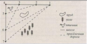 На рисунке изображен план сельской местности. Саша на летних каникулах приезжает в гости к дедушке в деревню Синицыно (на плане обозначена цифрой 1).