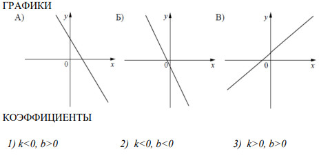 Задание 11. На рисунках изображены графики функций вида 𝑦 = 𝑘𝑥 + 𝑏. Установите соответствие между графиками функций и знаками коэффициентов k и b.