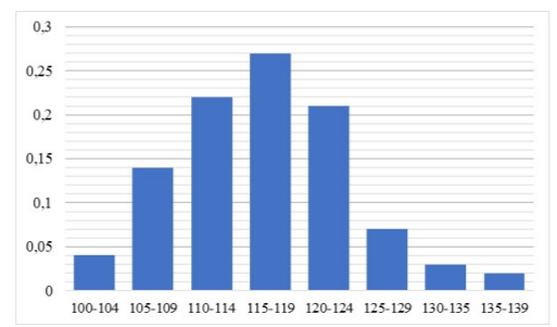 а) Найдите длину интервала группировки данных. б) Найдите вероятность того, что случайное измерение из данного массива окажется в пределах от 110 до 129 мм рт. ст.