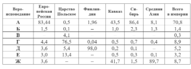 Задание 8. Ознакомьтесь с данными таблицы, отражающими конфессиональный состав населения России в 1870 году (в процентах от общего количества населения того или иного региона страны). На основании предложенных статистических данных определите, о какой конфессии идёт речь в каждой строчке таблицы.