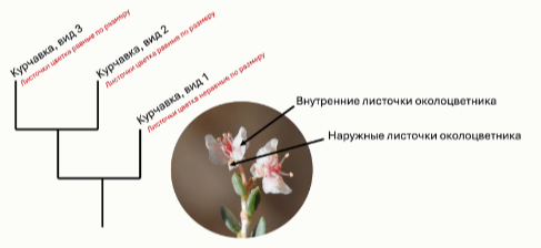 Изучите предложенное эволюционное дерево трёх видов курчавок с обозначенными особенностями размера листочков околоцветника. Подобное филогенетическое дерево, построенное по последовательностям ядерных генов, может помочь предсказать предковое состояние признаков и направление их эволюции.