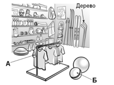 Задание 1. Рассмотри рисунок, на котором изображён спортивный магазин. Клюшка изготовлена из дерева. Она отмечена на рисунке стрелкой с соответствующей надписью.