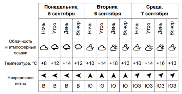 Задание 2. На интернет-сайтах, публикующих прогнозы погоды, можно встретить подобные таблицы. Внимательно изучи прогноз погоды на трое суток.