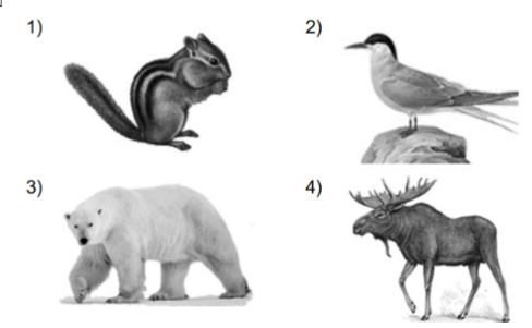А) бурундук Б) лось В) белый медведь Г) полярная крачка