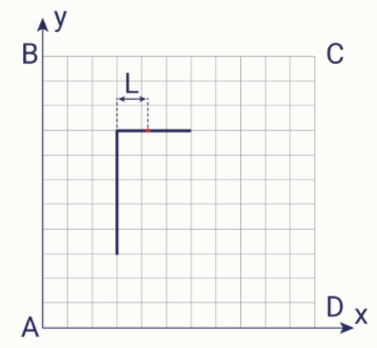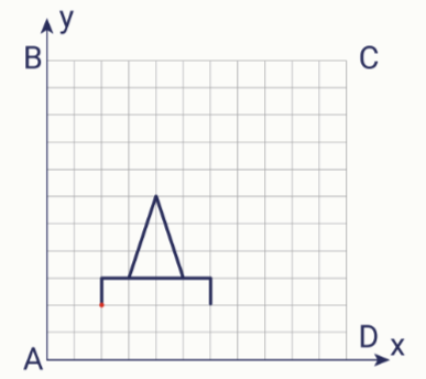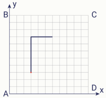 Тот самый подарок с уникальным номером оказался настоящим 3D‑принтером! Ребята решили немедленно опробовать новинку и напечатать по буквам слово «ГОД», чтобы повесить на ёлочку в качестве украшения. Печатающая головка принтера перемещается внутри рабочей области ABCD со стороной 11 см. Движение является последовательностью шагов длиной 0.1 мм, но поскольку величина шага очень мала, будем считать, что головка перемещается с постоянной скоростью. За раз головка может смещаться либо на один шаг вдоль стороны AB (ось y), либо на один шаг вдоль стороны AD (ось x). Если кроме перемещения происходит ещё и печать, то скорость движения уменьшается в 2 раза. На печать буквы «Г», начиная с красной точки, ушло 8 секунд.