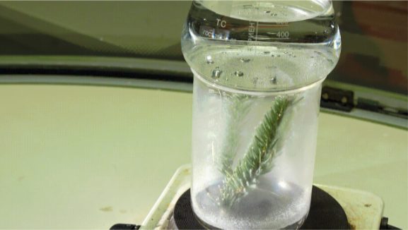 В химический стакан насыпают бензойную кислоту и начинают её аккуратно нагревать, закрыв колбой с холодной водой.