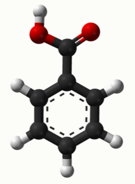 Дана модель молекулы бензойной кислоты. Чёрным цветом обозначены атомы углерода, красным — кислорода, белым — водорода.