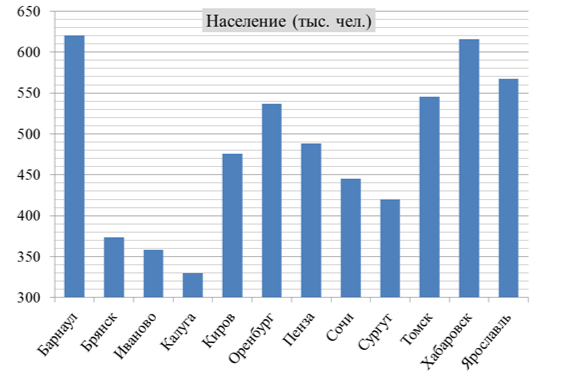 1) Укажите все города из указанных на диаграмме, население которых больше 400 тыс., но меньше 500 тыс. человек.