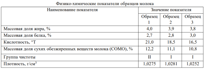 Технические условия» молоко должно удовлетворять следующим требованиям: массовая доля белка – не менее 2,8%, массовая доля жира не менее – 2,8%, массовая доля сухих обезжиренных веществ молока – не менее 8,2%, кислотность – от 16,0 до 21,0°Т включ., группа чистоты – не ниже II, плотность – не менее 1027 кг/м3. В ответе укажите номер образца молока, удовлетворяющего по качеству требованиям нормативного документа.