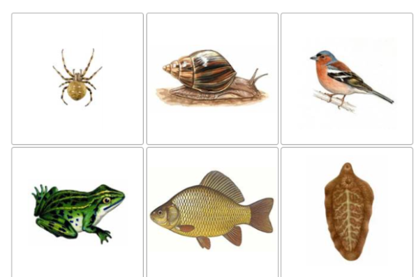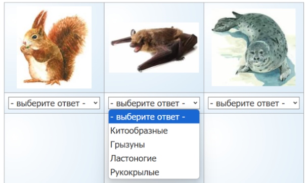 Перетащите изображения животных к их характеристикам и выберите из выпадающего списка класс данного животного. Среди представленных изображений есть лишние.