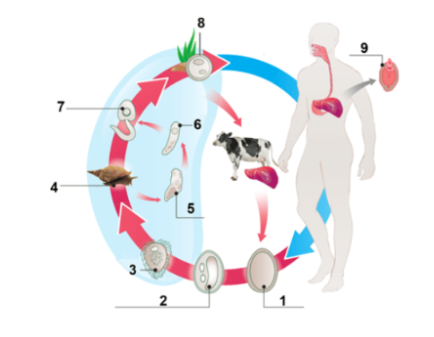 Какой цифрой на схеме обозначен промежуточный хозяин печёночного сосальщика?