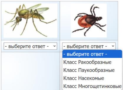 Задание 15. Рассмотрите изображения организмов, относящихся к разным классам членистоногих животных. Выберите из выпадающих списков классы представленных животных и перетащите перечисленные ниже признаки организмов к их изображениям. Среди признаков есть лишние.