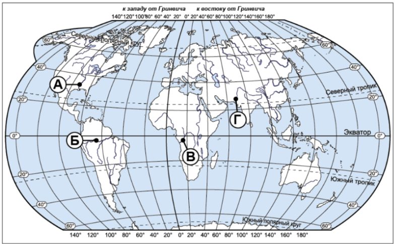 На карте мира пункты, для которых построены изображённые на рисунках климатограммы, обозначены буквами, соответствующими буквам климатограмм.