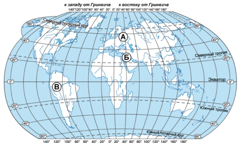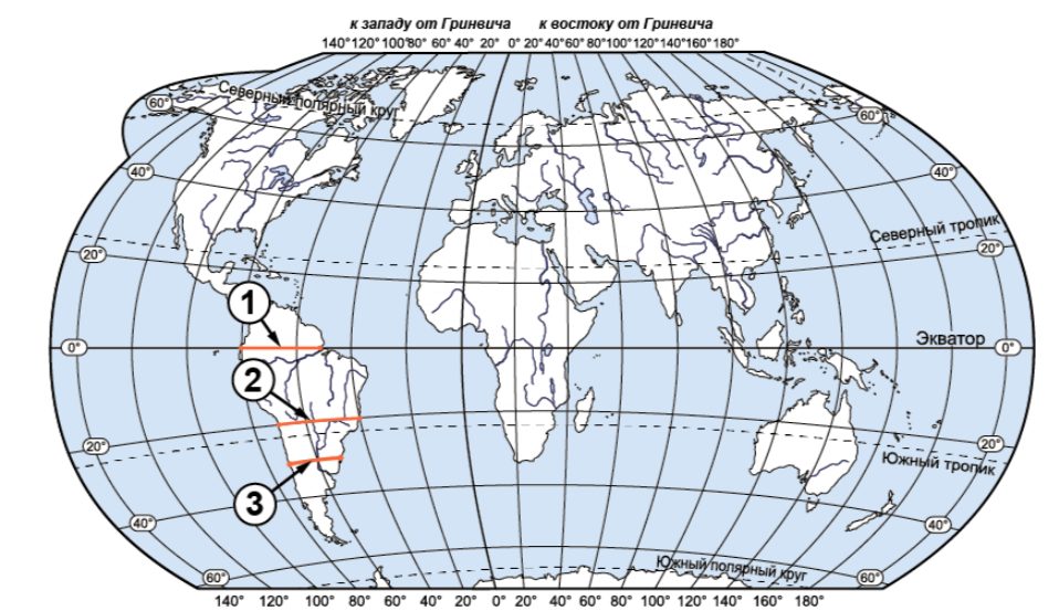 На карте мира через материк Южная Америка проведены три отрезка, обозначенные цифрами. Каждый из них соединяет точки с одинаковой географической широтой: 0° ш., 20° ю. ш. и 30° ю. ш.