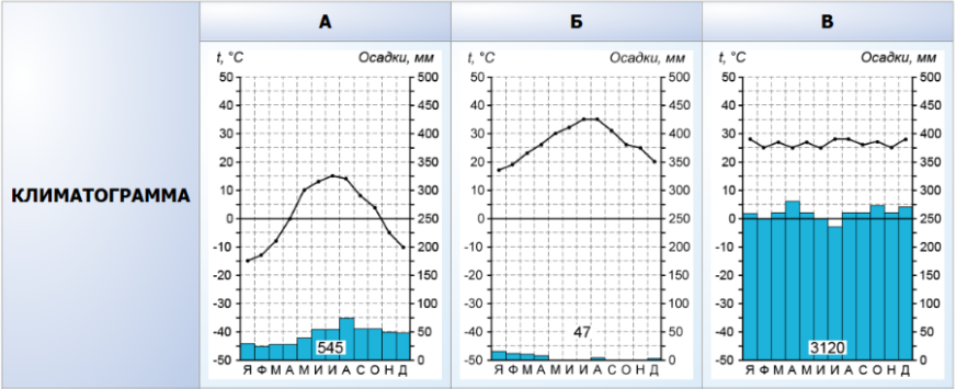 Задание 7. Выберите и отметьте любую из приведённых климатограмм и заполните таблицу климатических показателей, используя данные соответствующей климатограммы.