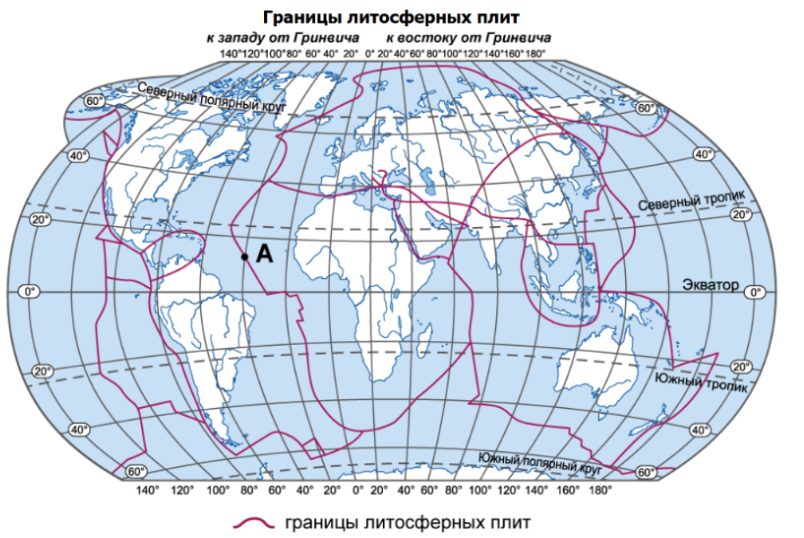 Задание 9Б. Определите, какой процесс происходит на границе литосферных плит в точке, обозначенной на карте буквой А.