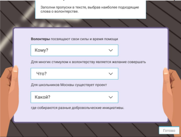 Тестируемый переходит к экрану, где представлена карточка с текстом, в котором есть пропуски, требующие заполнения. Кликая на пропуск, тестируемый видит выпадающий список и выбирает ответ.