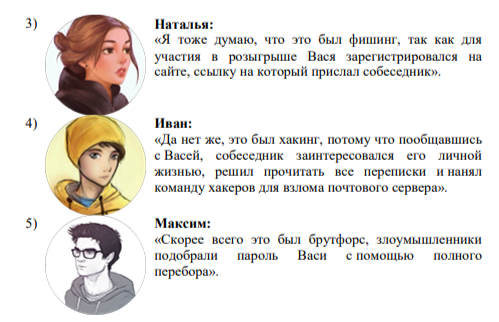 Ребята решили выяснить, что могло послужить причиной произошедшего взлома. С кем из ребят Вы согласны? Выберите два верных ответа.