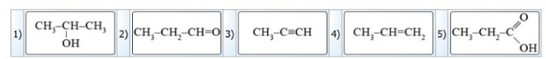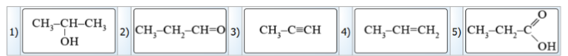 Задание 6Б. Из приведённого перечня выберите алкин и карбоновую кислоту. Переместите с помощью компьютерной мыши выбранные формулы в соответствующие ячейки.