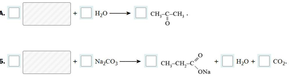Задание 12. В предложенные схемы химических реакций переместите с помощью компьютерной мыши структурные формулы пропущенных веществ, выбрав их из приведённого выше перечня. Где требуется, расставьте коэффициенты в пропущенных схемах, чтобы получились уравнения реакций. Для записи коэффициентов воспользуйтесь клавиатурой.