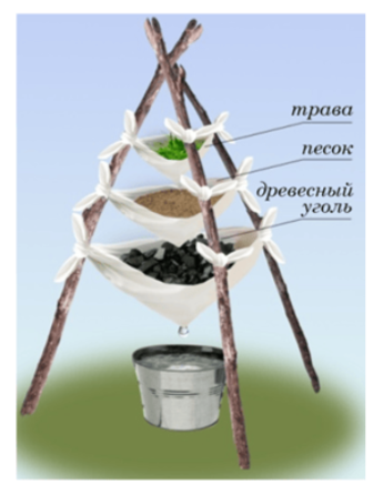 Задание 4. В туристическом походе иногда приходится использовать воду из природных источников, которая может содержать различные примеси, например, песок и ил. Использовать такую воду для приготовления пищи нельзя. Чтобы очистить природную воду от механических примесей, можно воспользоваться самодельным прибором, изображённым на рисунке.