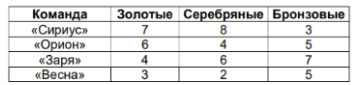 Задание 6.2. Какая команда заняла 3 место по сумме всех медалей? Обведи номер верного ответа. 1) «Сириус» 2) «Орион» 3) «Заря» 4) «Весна» В бланк ответов запиши ТОЛЬКО ЦИФРУ.