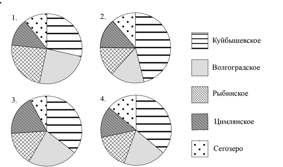 Задание 15. Объём воды в крупных водоёмах измеряют в кубических километрах (1 км3 = 1 млрд м3). В таблице указаны некоторые описательные характеристики объёмов пяти крупнейших водохранилищ Европейской части России: Волгоградского, Куйбышевского, Сегозера, Цимлянского и Рыбинского. Ниже даны четыре диаграммы, показывающие долю каждого водохранилища в их общем объёме. Только одна из диаграмм верная.