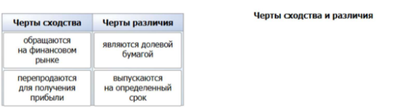 Задание 7.3. На уроке обществознания ученики 8 класса обсуждали основные элементы финансового рынка. Труднее всего было найти сходства и различия акций и облигаций. Переместите в первую колонку таблицы черты сходства, а во вторую колонку черты различия акций и облигаций.