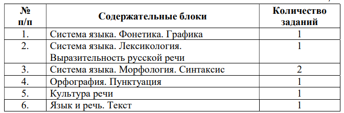Каждый вариант проверочной работы состоит из 5 заданий. Содержание проверочной работы охватывает учебный материал по русскому языку, изученный в 5-м классе. Распределение заданий по основным содержательным блокам представлено в таблице.