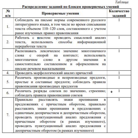Каждый вариант проверочной работы состоит из 7 заданий. Содержание проверочной работы охватывает учебный материал по русскому языку, изученный к моменту проведения диагностики. Проверочная работа содержит задания, направленные на проверку различных блоков умений, формируемых при изучении курса русского языка. Распределение заданий по блокам проверяемых умений представлено в таблице