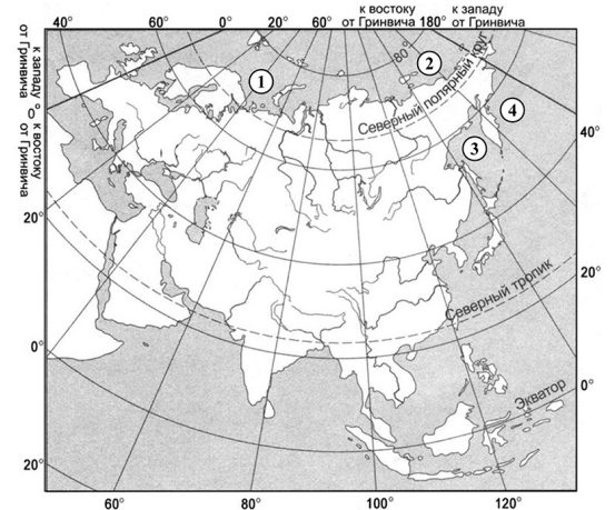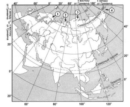 Задание 3. Россия имеет суверенные права на разведку и разработку природных ресурсов в пределах своего континентального шельфа. Установите соответствие между границами континентального шельфа России и цифрами, которыми они обозначены на рисунке: к каждому элементу первого столбца подберите соответствующий элемент из второго столбца.