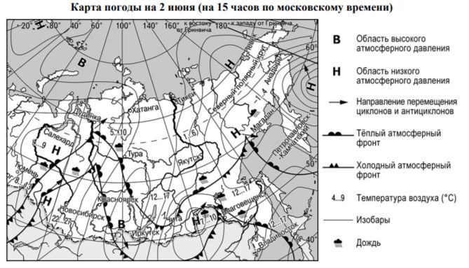 Задание 8. Аня из Якутска прослушала прогноз погоды по радио: «Завтра, 3 июня, ожидается потепление, в первой половине дня возможен дождь, ветер юго-западный, умеренный», но не услышала, для её ли города этот прогноз был составлен. С помощью карты определите, для какого из показанных на карте населённых пунктов был составлен этот прогноз.