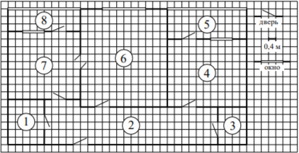 На рисунке изображён план двухкомнатной квартиры в многоэтажном жилом доме. Сторона одной клетки на плане соответствует 0,4 м, а условные обозначения двери и окна приведены в правой части рисунка. Вход в квартиру находится в коридоре. Слева от входа в квартиру находится санузел, а в противоположном конце коридора — дверь в кладовую. Рядом с кладовой находится спальня, из которой можно пройти на одну из застеклённых лоджий. Самое большое по площади помещение — гостиная, откуда можно попасть в коридор и на кухню. Из кухни также можно попасть на застеклённую лоджию.