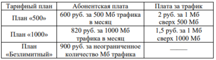 Задание 5. В квартире планируется подключить интернет. Предполагается, что трафик составит 650 Мб в месяц, и исходя из этого выбирается наиболее дешёвый вариант. Интернет-провайдер предлагает три тарифных плана.