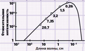 7. В середине прошлого века в телефонной компании Белла при изучении беспроводной передачи электромагнитных сигналов с длиной волны 7,35 см зарегистрировали шумы, которые посчитали аппаратными помехами. Позднее было обнаружено, что шумы фиксируются и на других длинах волн (см. график). Учёные до сих пор активно изучают эти сигналы, поскольку они являются…