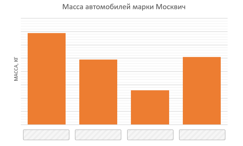 На столбиковой диаграмме показана полная масса четырёх автомобилей марки Москвич из таблицы. Установите соответствие между моделями автомобилей и столбиками диаграммы. Переместите с помощью компьютерной мыши модели автомобилей к соответствующим столбикам.
