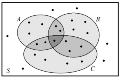 Задание 4. На диаграмме Эйлера изображён случайный опыт S и три события A, B и C в нём. В этом опыте 25 равновозможных элементарных событий, они показаны точками. Найдите вероятность события A ∩ B ∩ C. Результат не округлять.