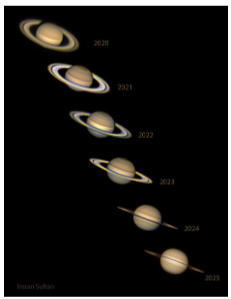 Задание 9. На изображении показан вид Сатурна с Земли в разные годы. Видно, что его кольца меняют свою ориентацию. Почему это происходит?