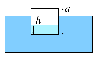 Задание 3: Небольшая емкость, имеющую форму полого кубика без верхней грани, плавает в ванне с водой. Максимальный уровень, на который емкость можно наполнить водой до того, как она утонет, составляет h=12 см. Уровень наполнения ёмкости отсчитывается от дна емкости. Длина стороны емкости a=15 см. На какую глубину пустая емкость погружена в воду до наполнения ее водой? Толщиной стенок ёмкости пренебречь. Ответ выразите в сантиметрах и округлите до целых.