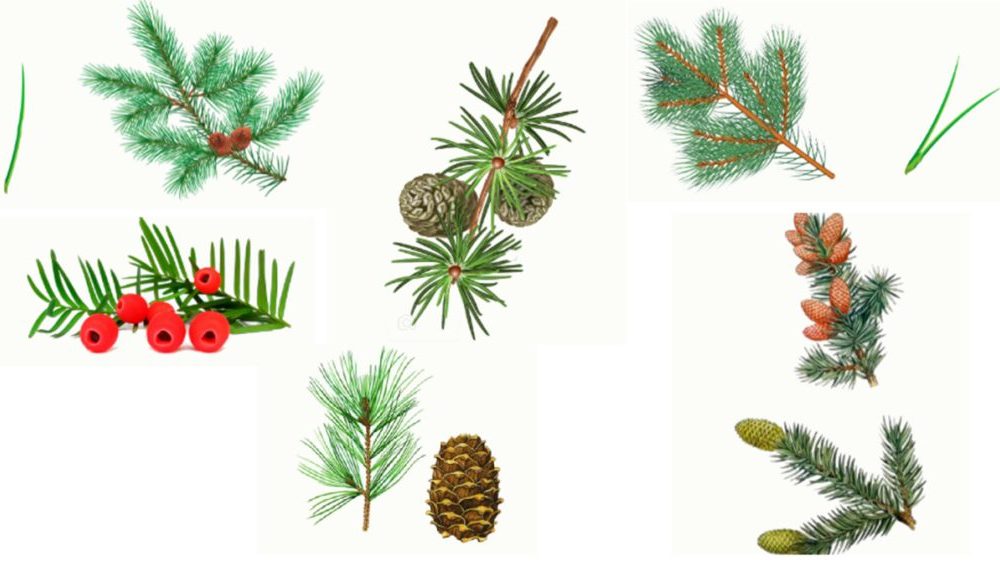 Ель голубая, Ель обыкновенная, Лиственница обыкновенная, Сосна обыкновенная, Сосна сибирская, Тис ягодный